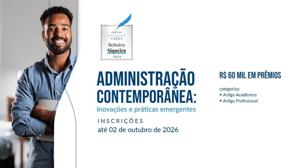 14 abril, 2026 13 abril, 2026 7 abril, 2026 14 abril, 2026 13 abril, 2026 7 abril, 2026 ADM+ portal de benefícios ADM Talentos & empregos Revista RBA IGM - CFA CFAPlay Publicações e Cartilhas ACAdm - Academia Corporativa Transparência CFA Faça seu Registro ADM Agência de Notícias Valendo R$ 60 mil: Prêmio CFA de Jornalismo abre inscrições para edição 2026Eleições com segurança preservam o futuro da democracia na administraçãoCalendário das Eleições – tudo o que você precisa saber, encontre aquiCFA e CRA-SC marcarão presença no Summit Cidades 2026 com inovação e soluções públicasLideranças de conselhos articulam fortalecimento da fiscalização profissional com o TCUEleições 2026 do Sistema CFA/CRAs vêm aí. Saiba mais informações‘Conexão CRA Jovem Maranhão’ acontecerá no Erpa Nordeste 2026Reunião do Proder analisa projetos de CRAs de todo o BrasilAcordo de Cooperação Técnica entre CFA e MTE é renovado por novo período Carregar mais notícias Notícias CFA/CRAs CRA-RR realiza “Encontro Mulheres que Inspiram” e traz Gilda Nunes como inspiração da primeira ediçãoCRA-PB reinaugura sede e celebra Jubileu de Diamante da Administração com solenidade Diagnóstico Brasil IGM-CFA revela disparidades regionais e reforça papel da Administração na gestão pública30ª Edição do Congresso Nacional de Administração é sucesso de público e marca os 60 anos da profissãoPresidente do CFA participa de evento em homenagem à prefeita Gislaine Landim por gestão eficienteEBA 2025: Maceió é palco nacional da Administração, Inovação e LiderançaPresidente da ANPAD fala sobre sustentabilidade em gestão no EnANPAD 2025Nota de pesar – Sr. Manoel Leônidas Carregar mais notícias CFA/CRAs Eventos CFA/CRAs There are no upcoming events at this time Últimas Publicações Confira outras publicações