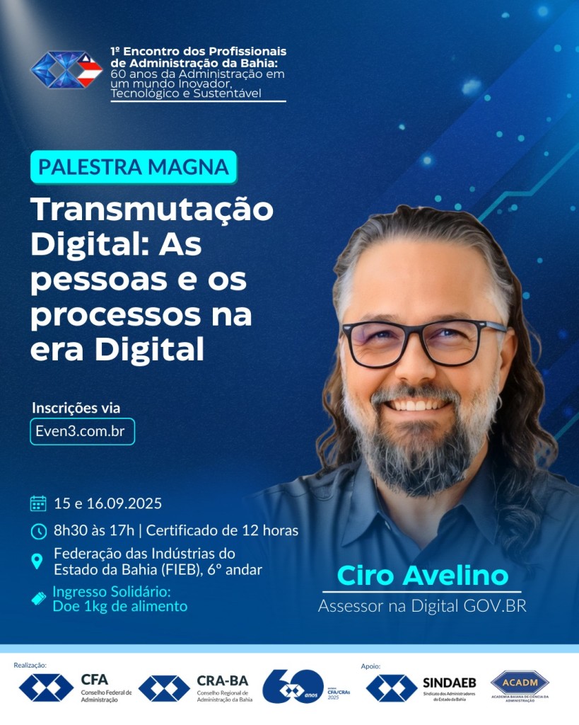 Com o tema “Administração com propósito, tecnologia e um toque de Bahia”, a programação promete discutir os novos rumos da área diante das transformações digitais, além de trazer reflexões sobre inovação, gestão e futuro do trabalho. A palestra magna será conduzida por Ciro Avelino, que apresentará o tema “Transmutação Digital”, explorando como pessoas e processos estão se reinventando na era digital.