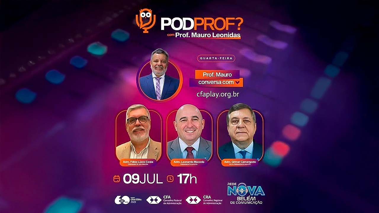 Nesta quarta-feira (9), às 17h, o programa ao vivo PodProf?, comandado pelo professor e Conselheiro do CFA, Adm. Mauro Leonidas, recebe convidados especiais. O presidente do CFA, Adm. Leonardo Macedo, o vice-presidente do CFA, Adm. Gilmar Camargo, e o presidente do CRA/PA, Adm. Fábio Lúcio Costa, estarão presentes para um bate-papo sobre o Encontro Brasileiro de Administração (ENBRA) e os 60 anos da regulamentação da profissão de administrador.