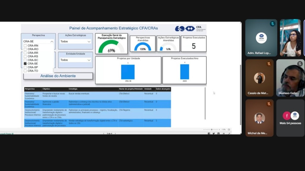 Durante o momento, foi apresentada a nova plataforma de Planejamento Estratégico construída pela Câmara, com detalhes de suas funcionalidades e benefícios. A ferramenta representa um importante avanço na gestão dos projetos estratégicos desenvolvidos nos Conselhos Federal e Regionais de Administração, promovendo uma melhor padronização, organização e eficiência nos processos do Sistema.