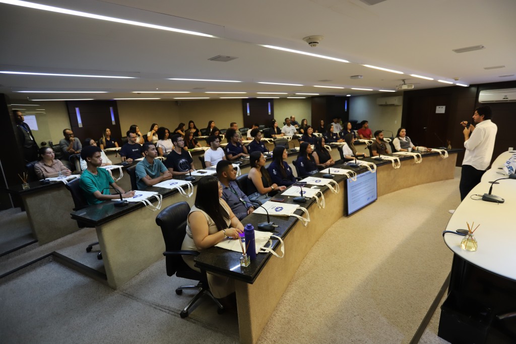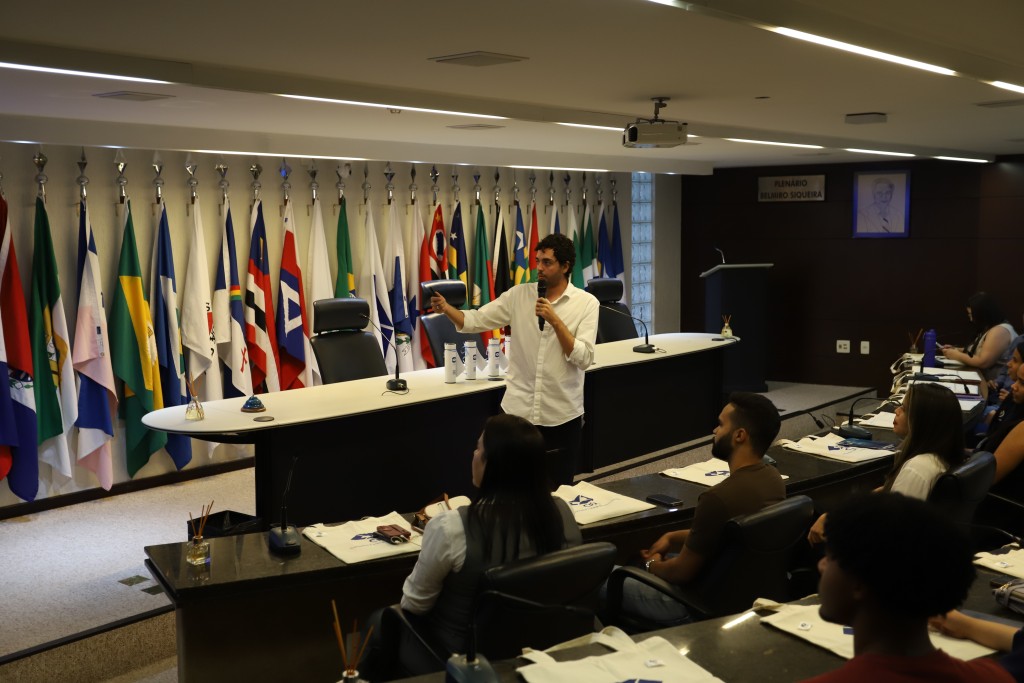 No plenário do Conselho, os alunos conferiram a palestra do estagiário da Câmara de Serviços aos Registrados do CFA, Marcos Formiga. Estudante do curso de Administração da UnB, coube a ele falar sobre o Sistema CFA/CRAs e a ações e projetos realizados pela autarquia.